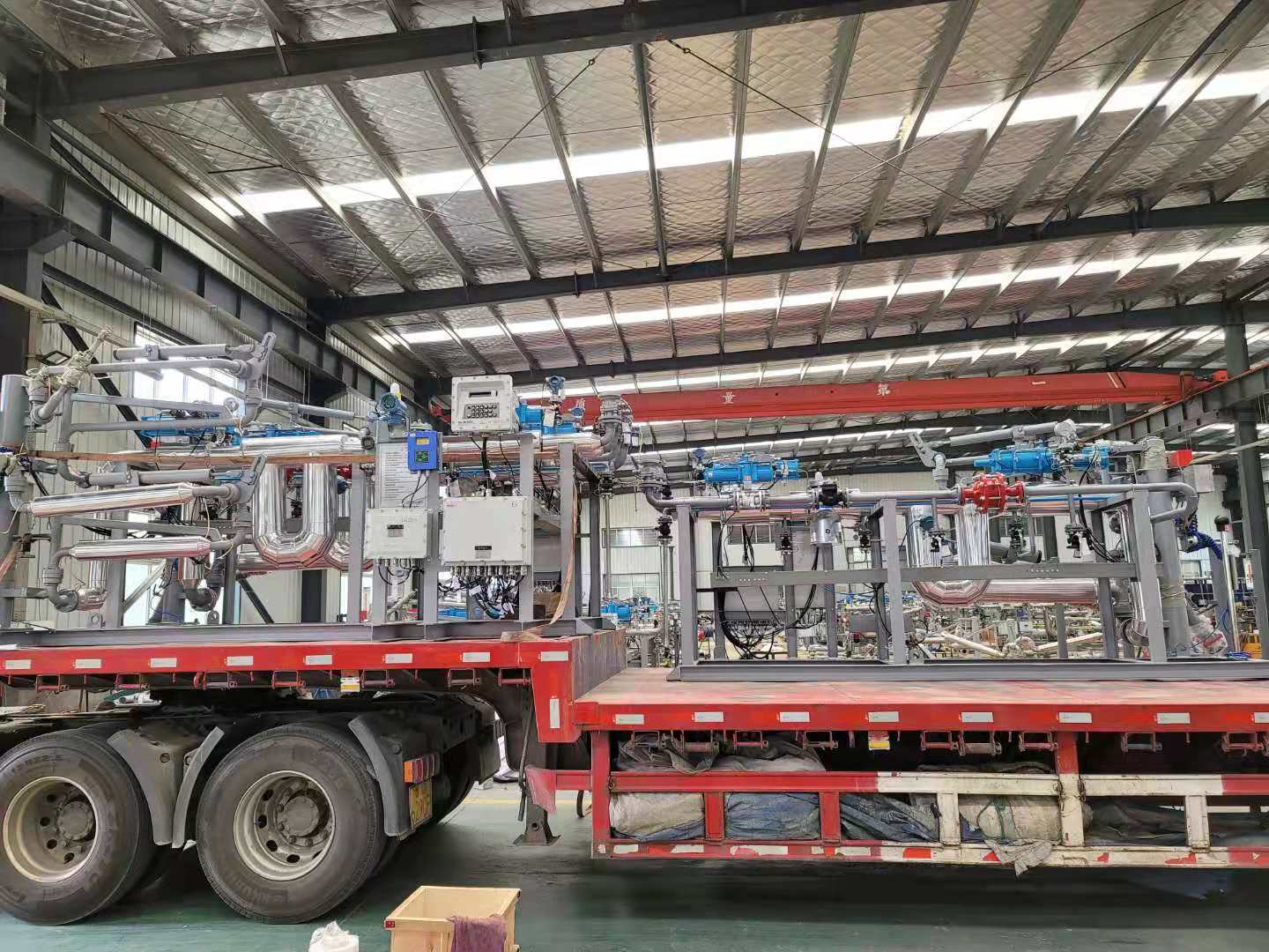 油品及化工品定量裝車橇裝組是指將每一個(gè)裝車鶴位內(nèi)的儀表和設(shè)備集成在一個(gè)專用的框架結(jié)構(gòu)內(nèi),儀表和設(shè)備包括裝車鶴管、流量計(jì)、防溢油靜電報(bào)警控制器、壓力變送器、裝車流量控制閥、緊急切斷閥,裝車泵、批量控制器等, 只預(yù)留工藝連接口和控制電源和通訊接口,這個(gè)整體集成部分稱為裝車橇。與傳統(tǒng)的裝車控制系統(tǒng)就地組裝比較,裝車橇可以節(jié)省現(xiàn)場(chǎng)設(shè)計(jì)和現(xiàn)場(chǎng)施工量,縮短項(xiàng)目工期,提高裝車控制系統(tǒng)的質(zhì)量。以下是近期公司定量裝車撬的生產(chǎn)及發(fā)貨現(xiàn)場(chǎng)。